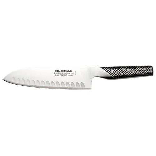 Global G-80 18cm Fluted Santoku Knife – designed for slicing, dicing and mincing, this is a great all-purpose knife that benefits from a fluted blade to reduce adhesion and improve food release, particularly useful when cutting starchy vegetables.