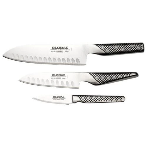 This Global G-804690 3 Piece Knife Set comprises a G-80 18cm Fluted Santoku Knife, a GS-90 13cm Fluted Santoku Knife and a GSF-46 8cm Peeling Knife.