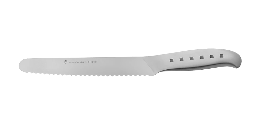The Tojiro Sharaku Mono 17.5cm Bread Knife (FJ-05) is part of the Sha Ra Ku Mono range which has a distinctive angular pattern, to call back to the traditional Samurai sword, whilst the black dot motif in the handle represents a row of urban windows. A large serrated knife that is great for slicing foods with thick crusts or rinds like artisan breads and melons/gourds. It also cuts through soft bread without crushing it.
