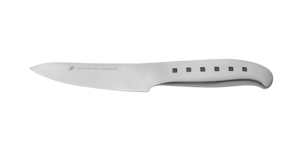The Tojiro Sharaku Mono 11cm Utility Knife (FJ-07) is part of the Sha Ra Ku Mono range which has a distinctive angular pattern, to call back to the traditional Samurai sword, whilst the black dot motif in the handle represents a row of urban windows. Versatile, smaller knife for slicing, mincing and prep work. The utility knife is between a chef’s knife and paring knife in size. A great multipurpose knife for fruits, vegetables with fine skins or soft insides. Ideal knife for slicing salami, sausage, avocados and small soft or hard-crusted bread.